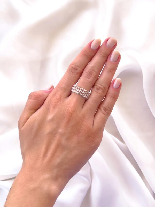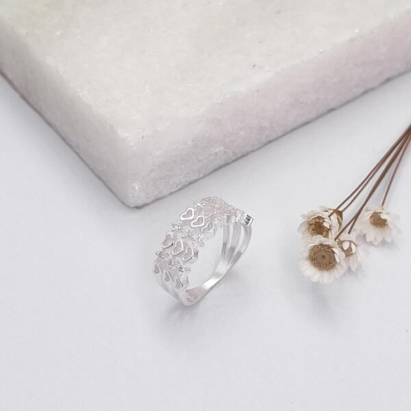 Detalhes Anel em prata aro 3 carreiras com mini corações vazados e mini zircônias entre eles.