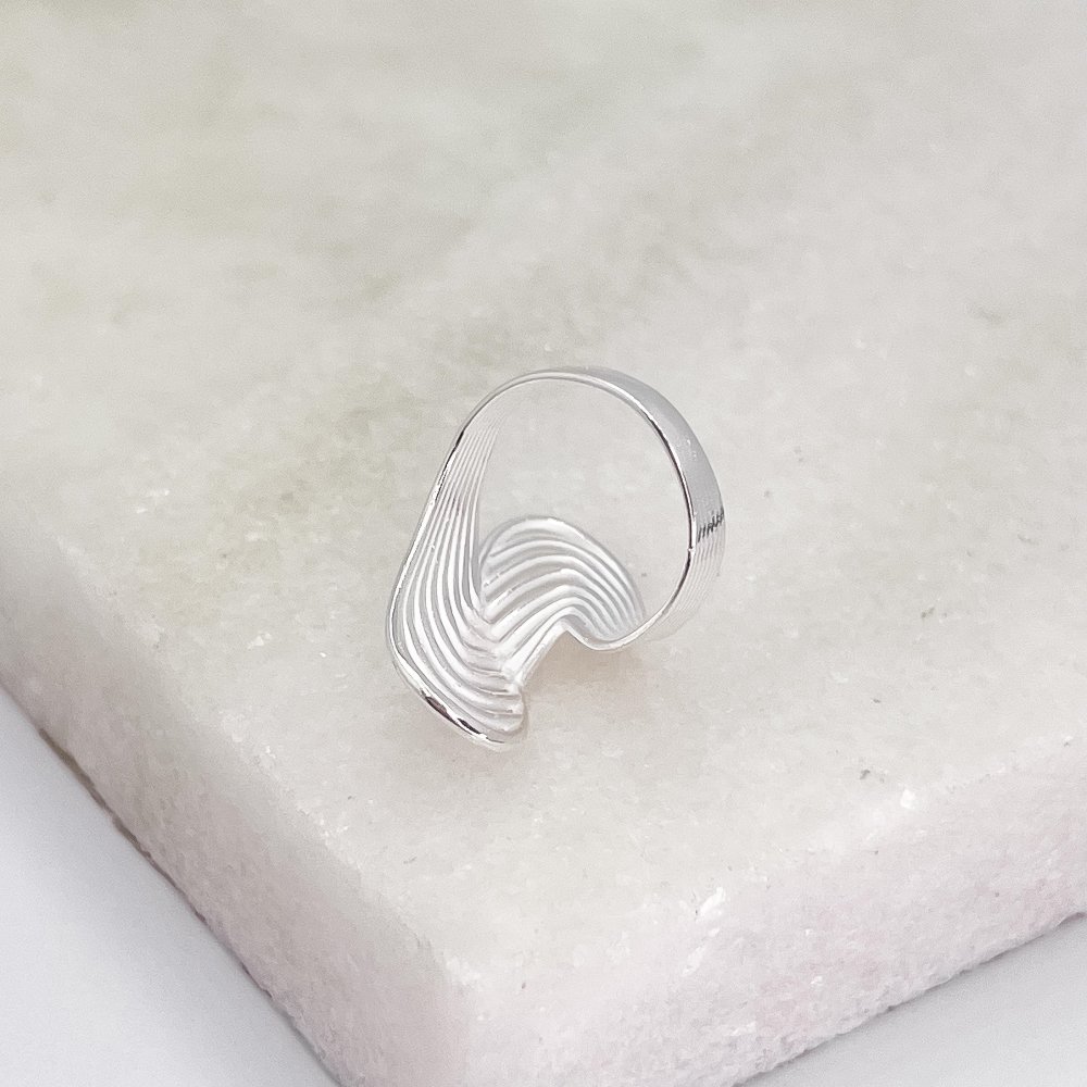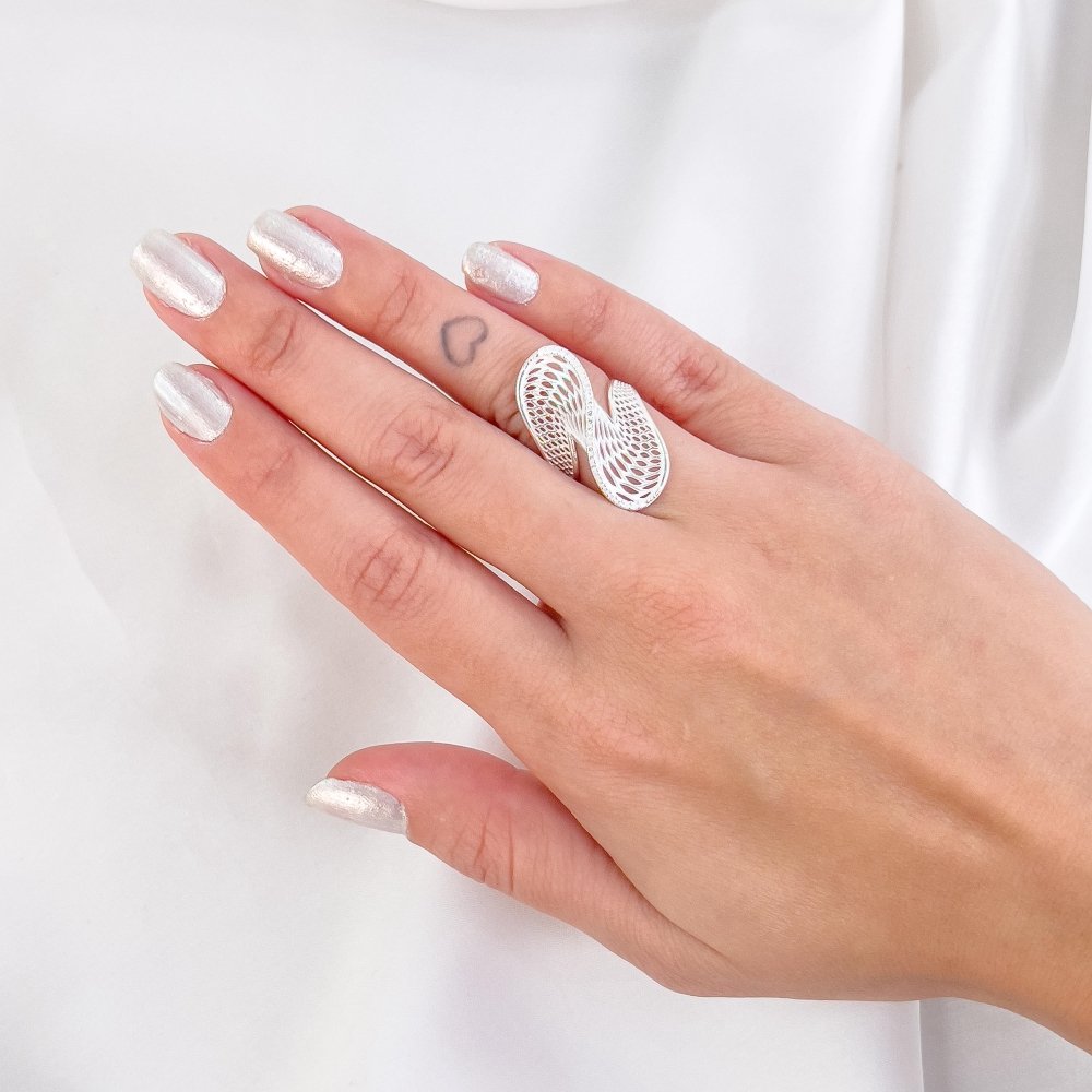Detalhes Anel em prata em 3 D telado com formato indefinido.