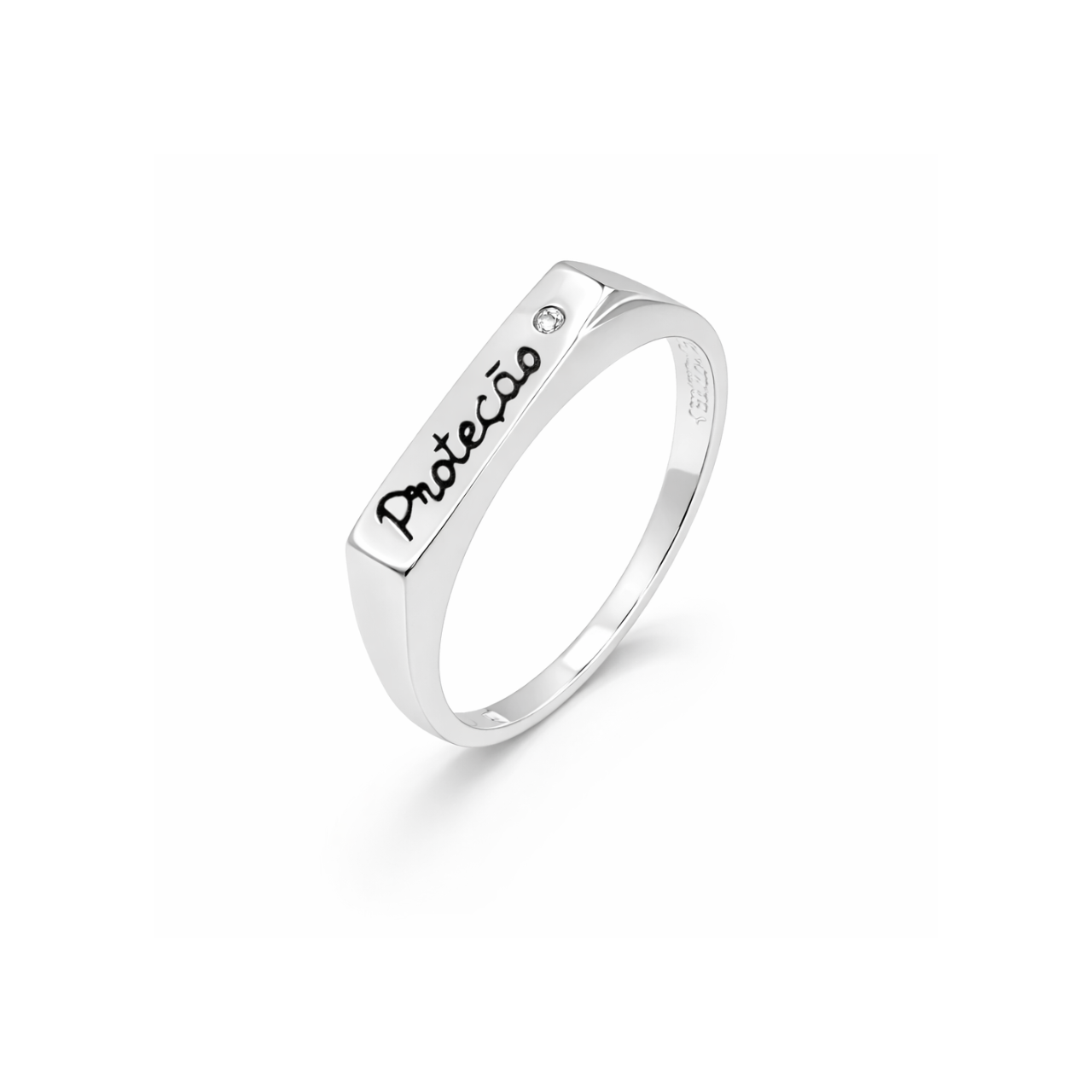Detalhes Anel em prata chapa reta com detalhe de frase escrita ”Proteção” e mini zircônia.