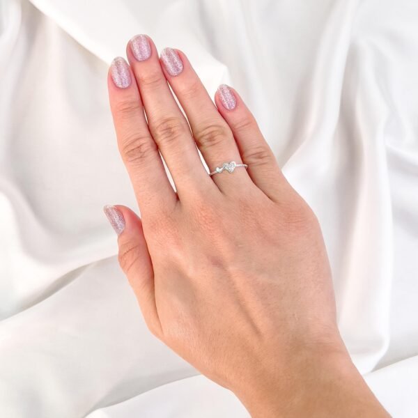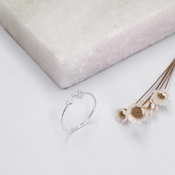 Detalhes Anel prata delicado com aro detalhado, dois corações um liso e um cravejado