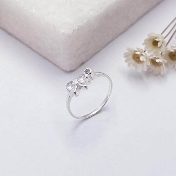 Detalhes Anel em prata com detalhe em formato de lacinho e zircônia no meio.