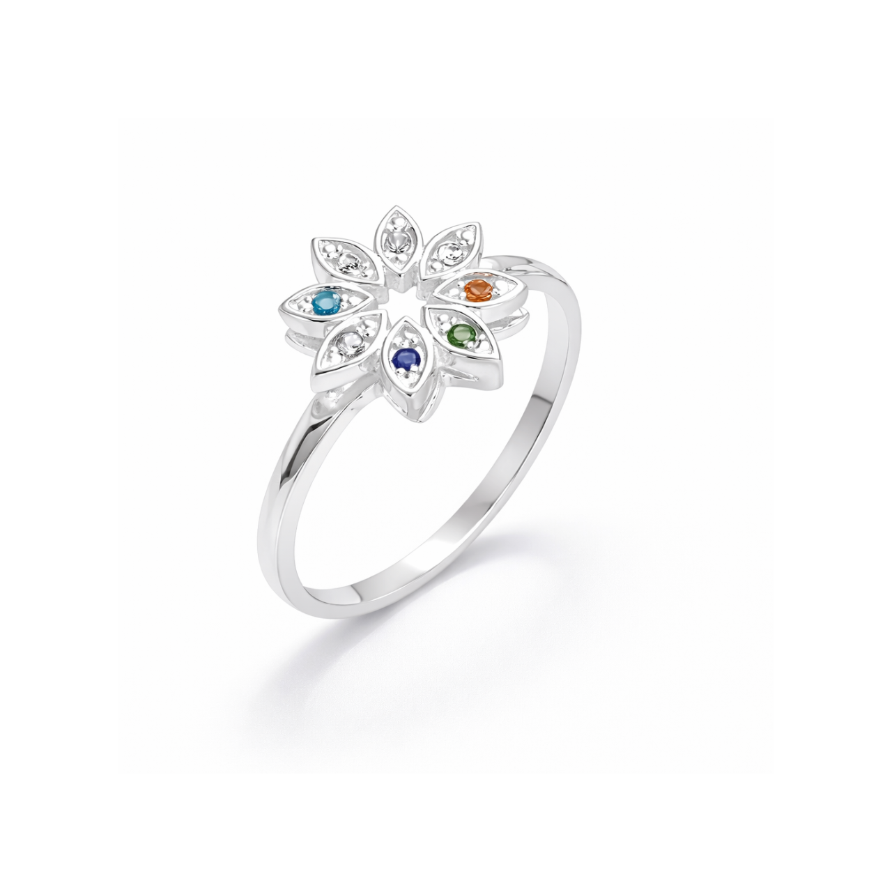 Detalhes Anel em prata Margarida cravejada colorido caixa alta.