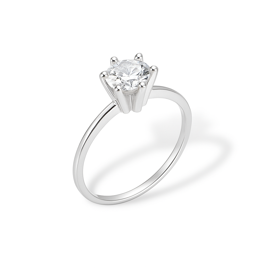 Detalhes Anel em prata solitário; com zircônia medindo 06 mm; grifa alta