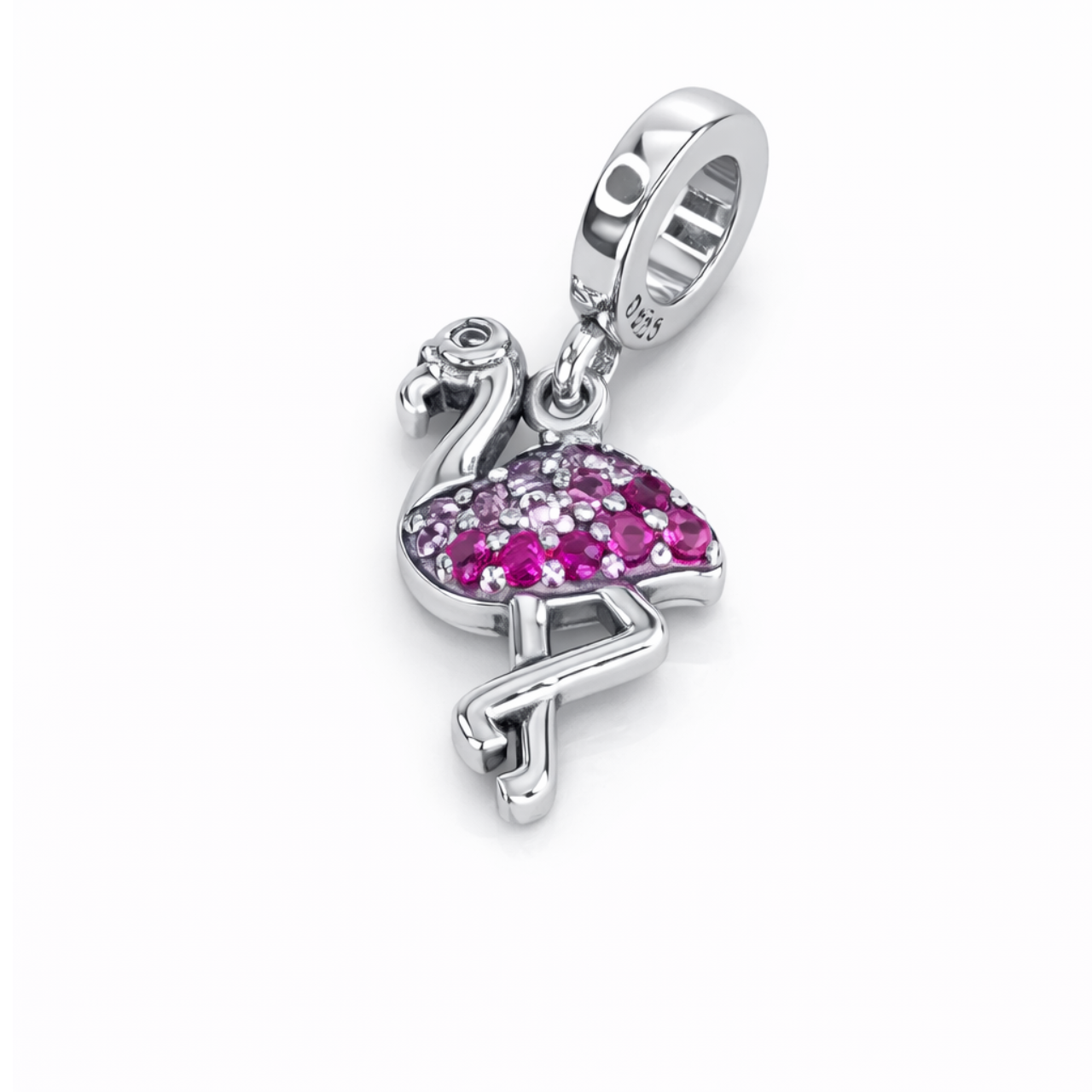 Detalhes Berloque prata ródio flamingo cravejado rosa