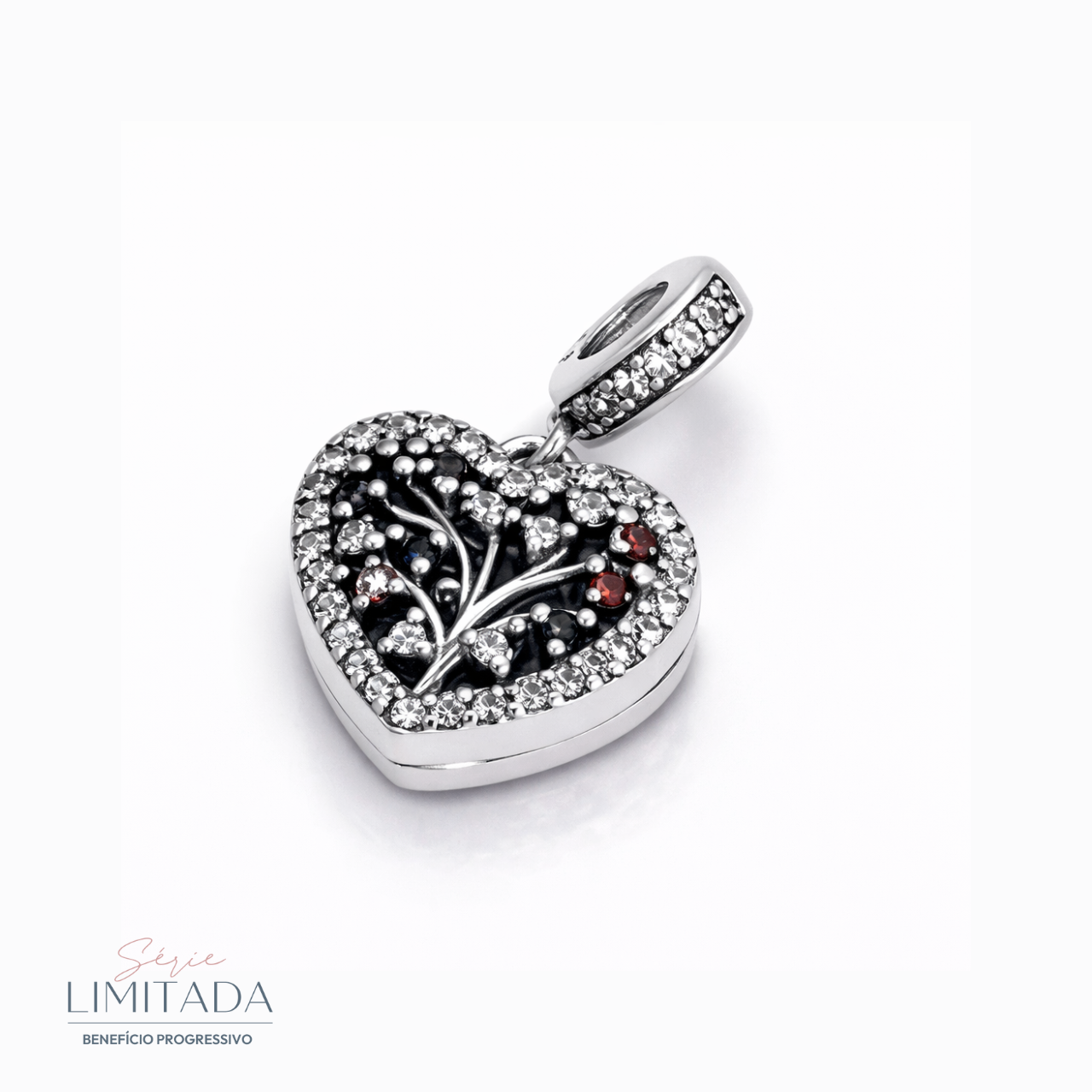 Detalhes Berloque prata ródio relicário cravejado com zircônias coloridas no desenho da árvore da vida, no verso escrita e internamente possui um pingente no formato de coração