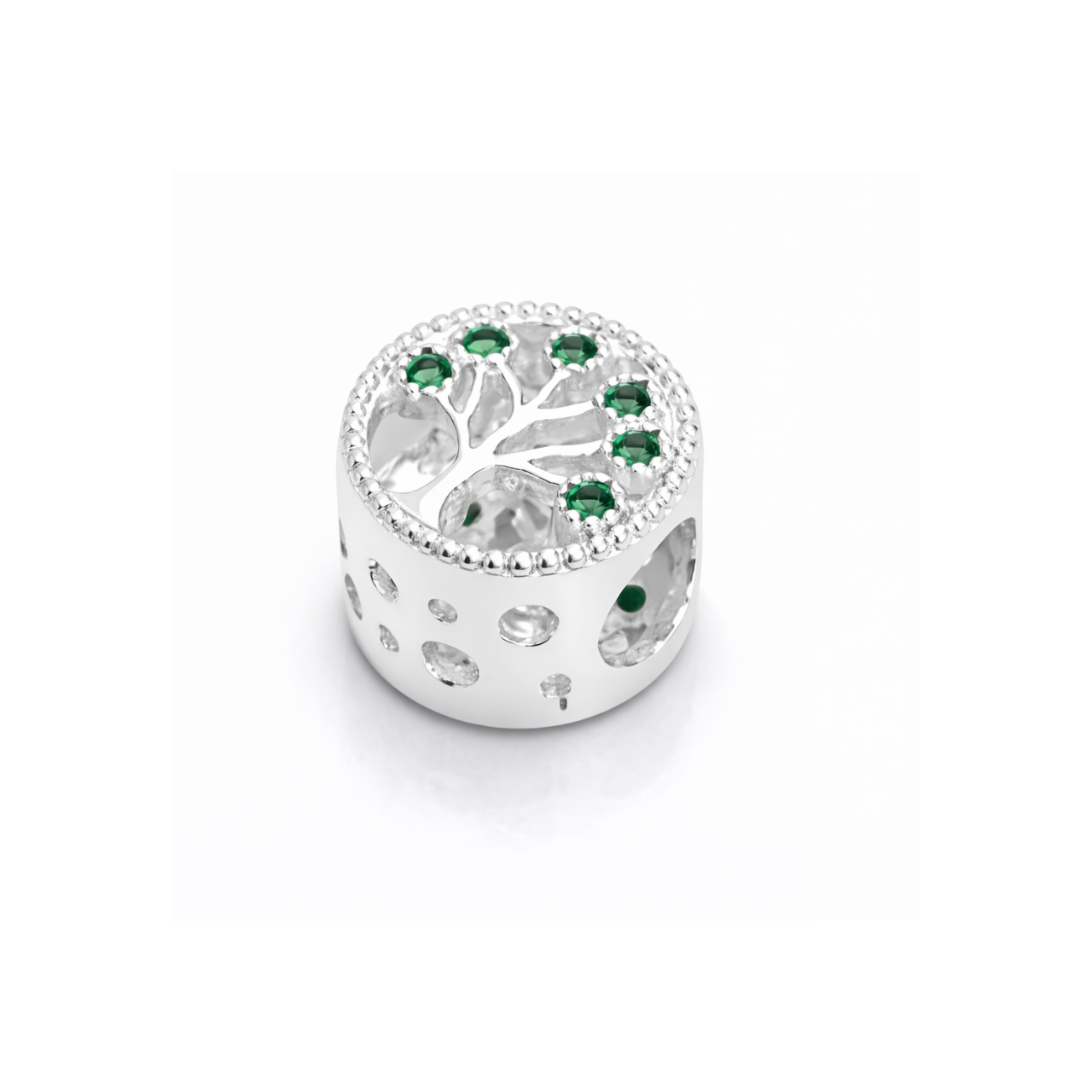 Detalhes Berloque em prata árvore dos sonhos com detalhe de zircônias verde