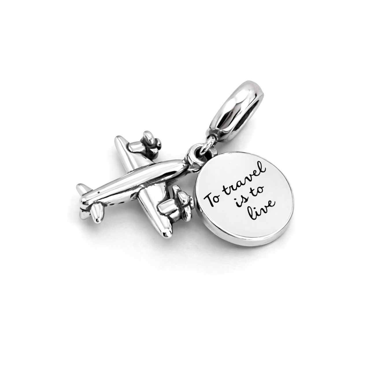 Berloque Prata Viagem Aviao/ Medalha”To Travel Is To Live”