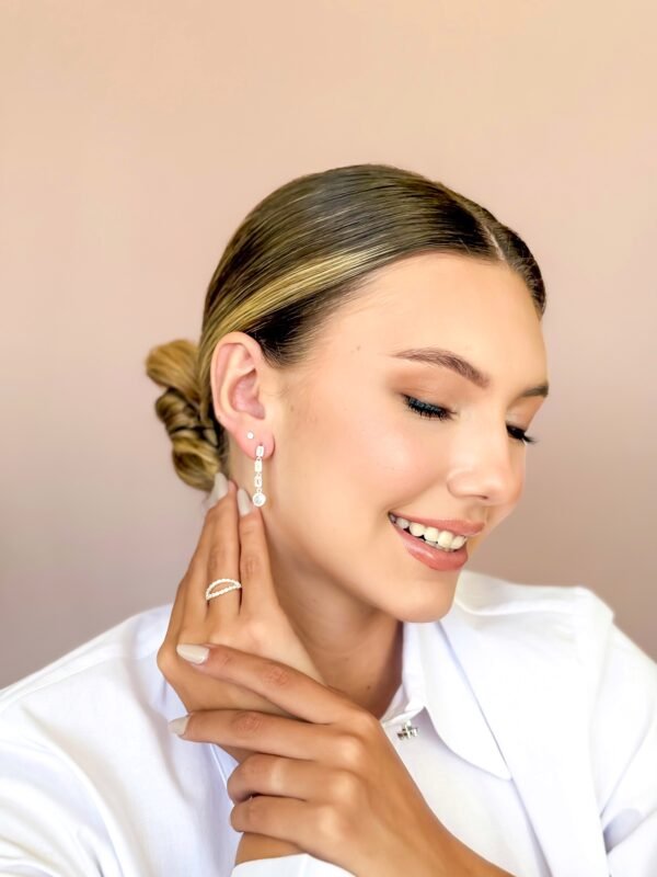 Detalhes Brinco em prata com 03 zircônias no formato quadrado e 01 zircônia redonda