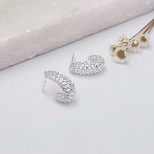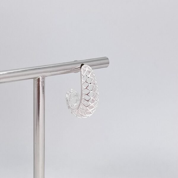 Detalhes Brinco em prata , modelo abaulado com telinha vazada, med. 2,0cm.