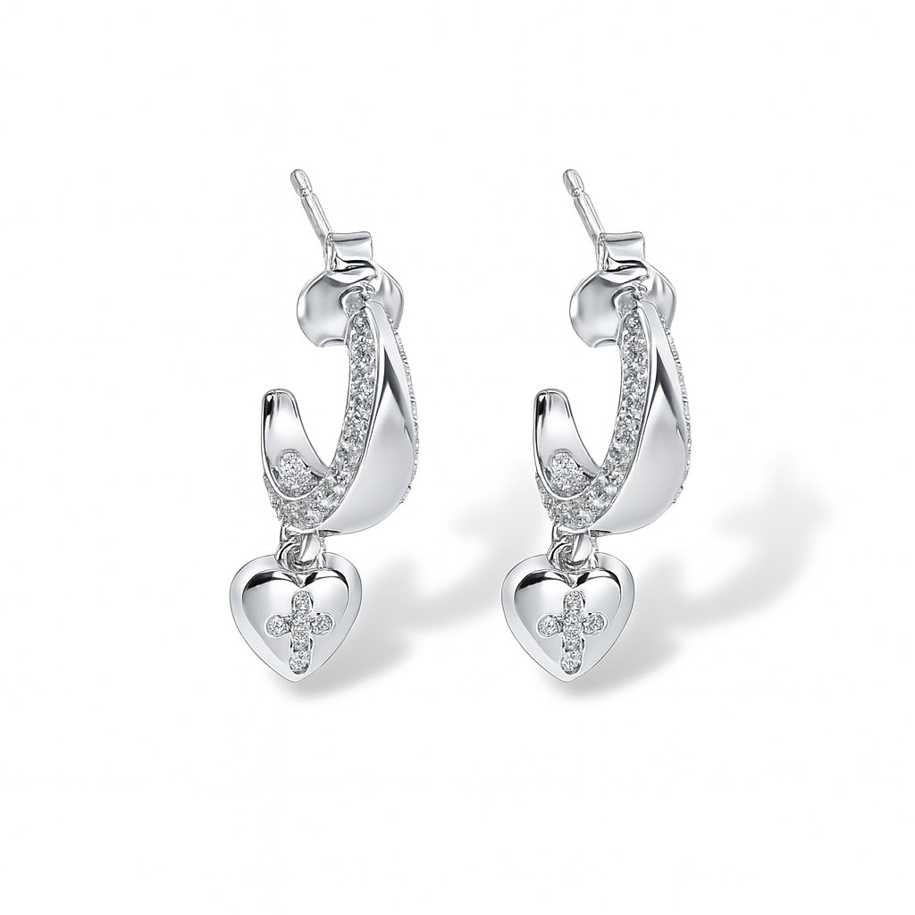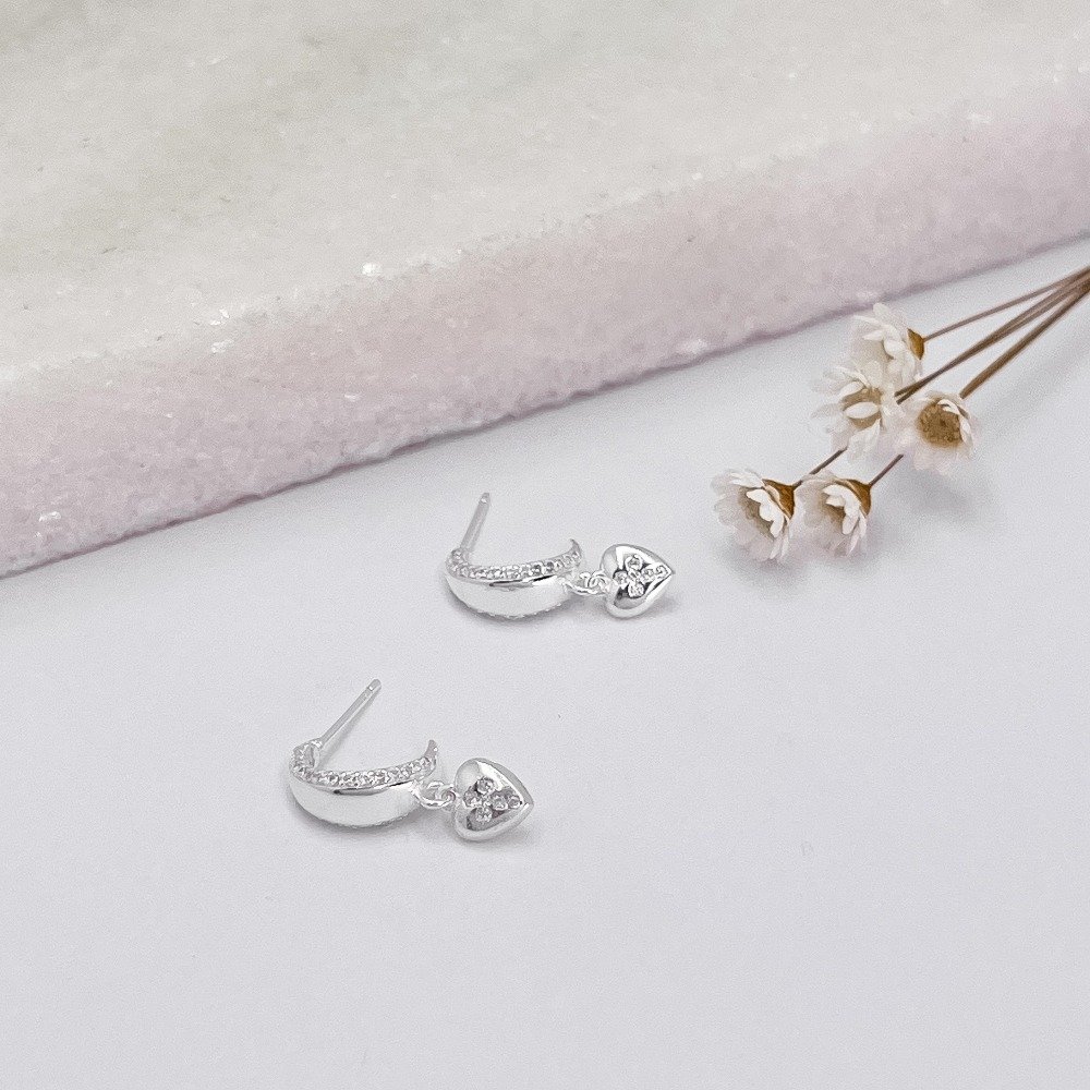 Detalhes Brinco argola prata abaulado com as bordas cravejadas e pendure de zircônia em coração
