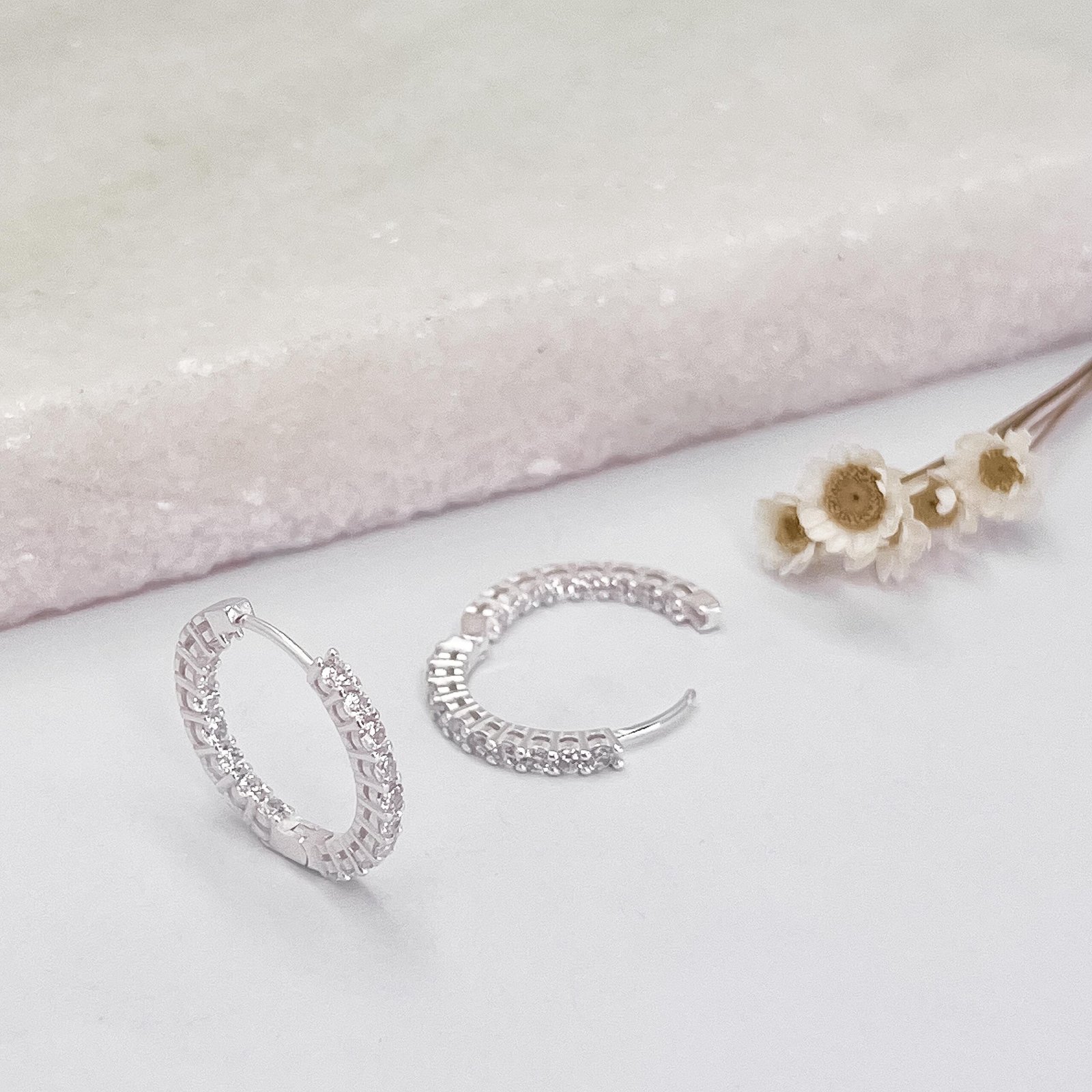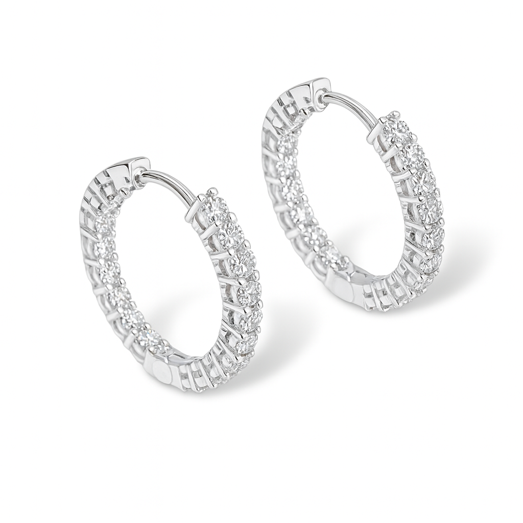 Brinco prata argola cravejada na frente e parte atrás cravejada internamente, com zircônias 0,3 mm cristal.