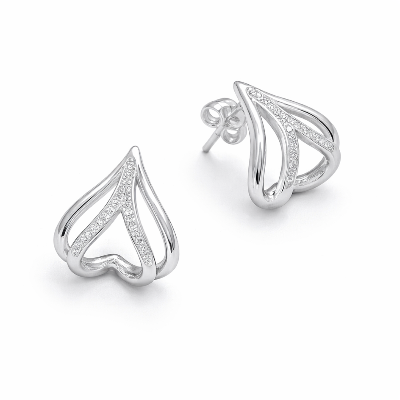 Detalhes Brinco prata folha curva vazada com fios cravejados e lisos