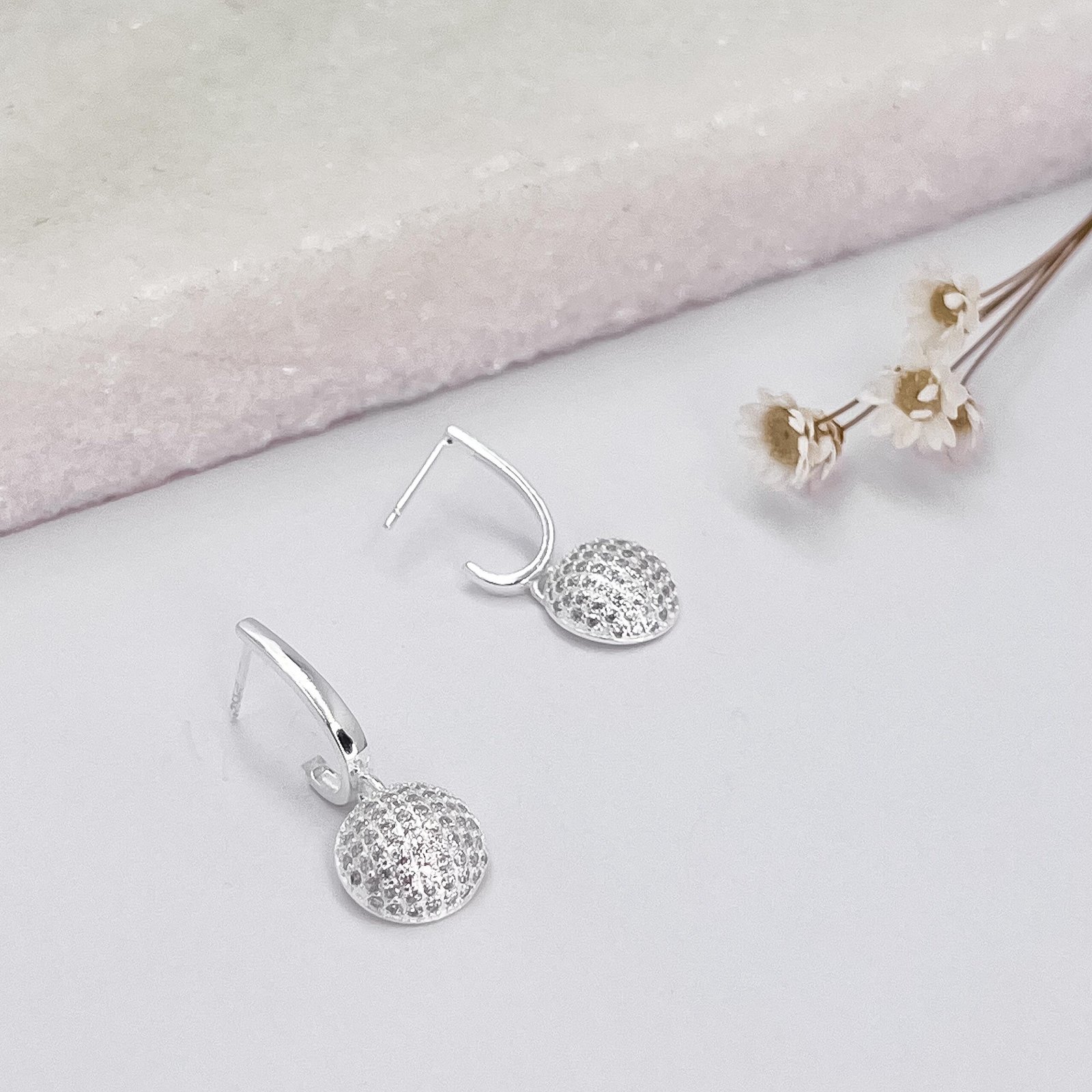 Início BRINCOS Abaulado Brinco Prata Pendulo Liso Meia Bola Cravejada