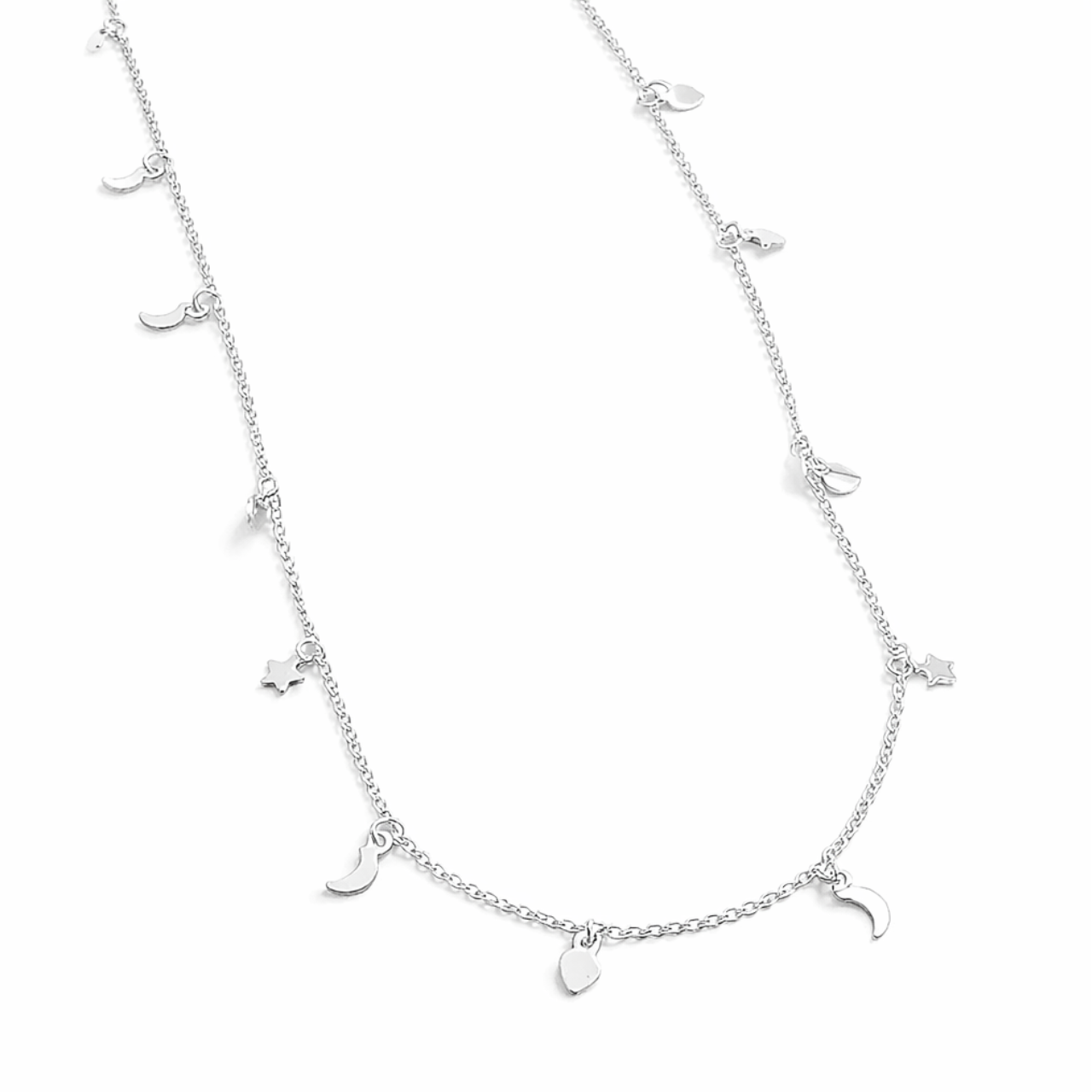 Detalhes Choker em prata com chapas de lua, estrela e coração