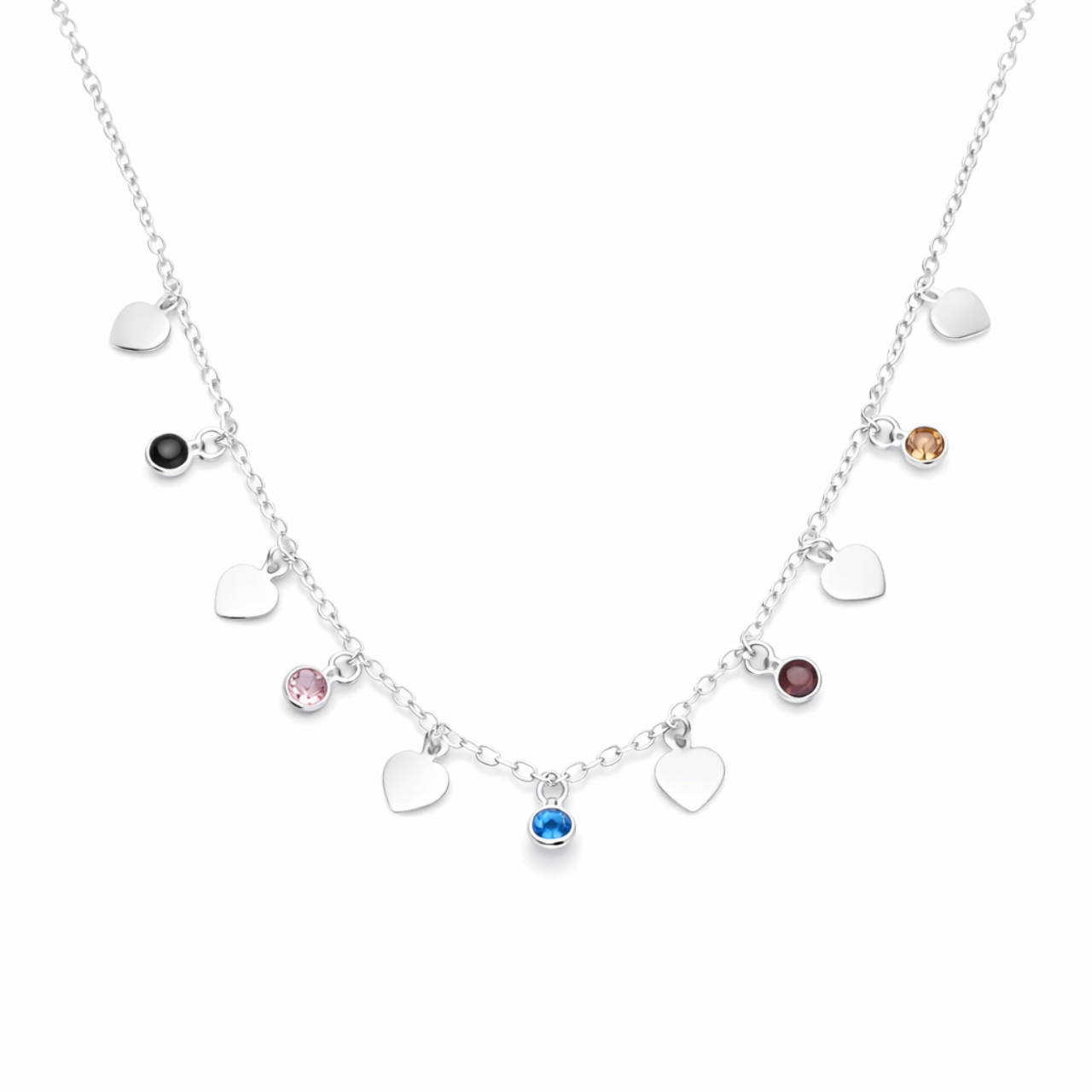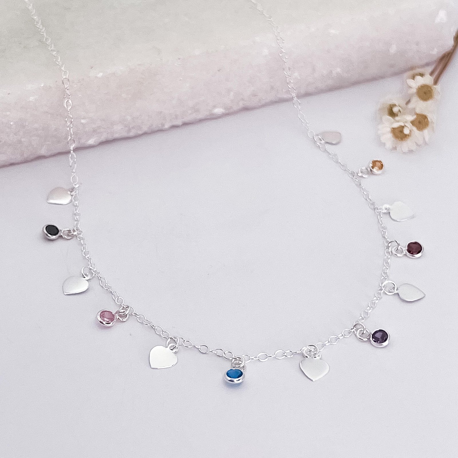 Detalhes choker prata elos com corações lisos e zirconia coloridas