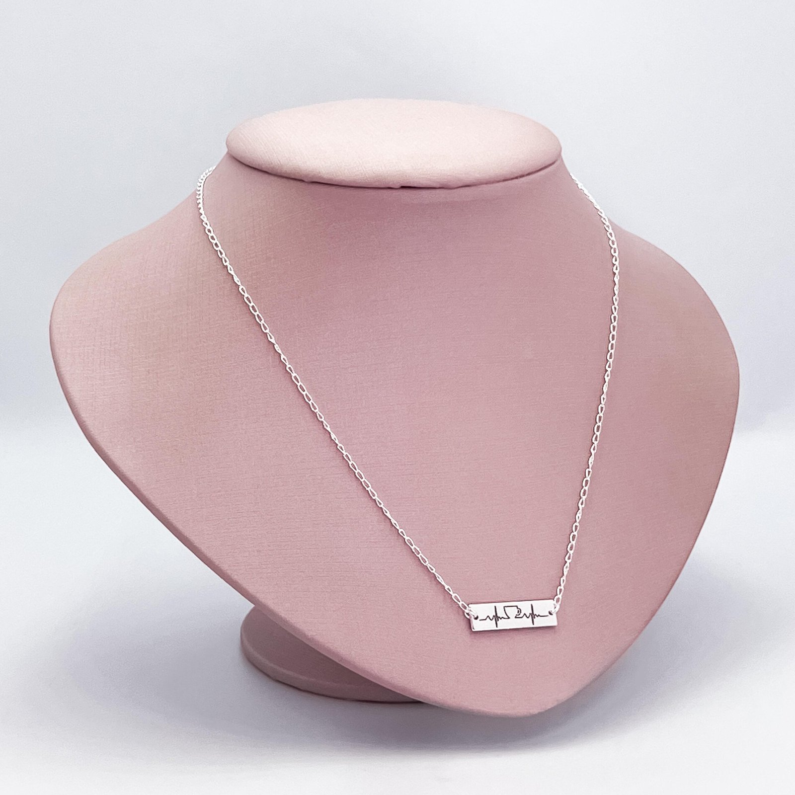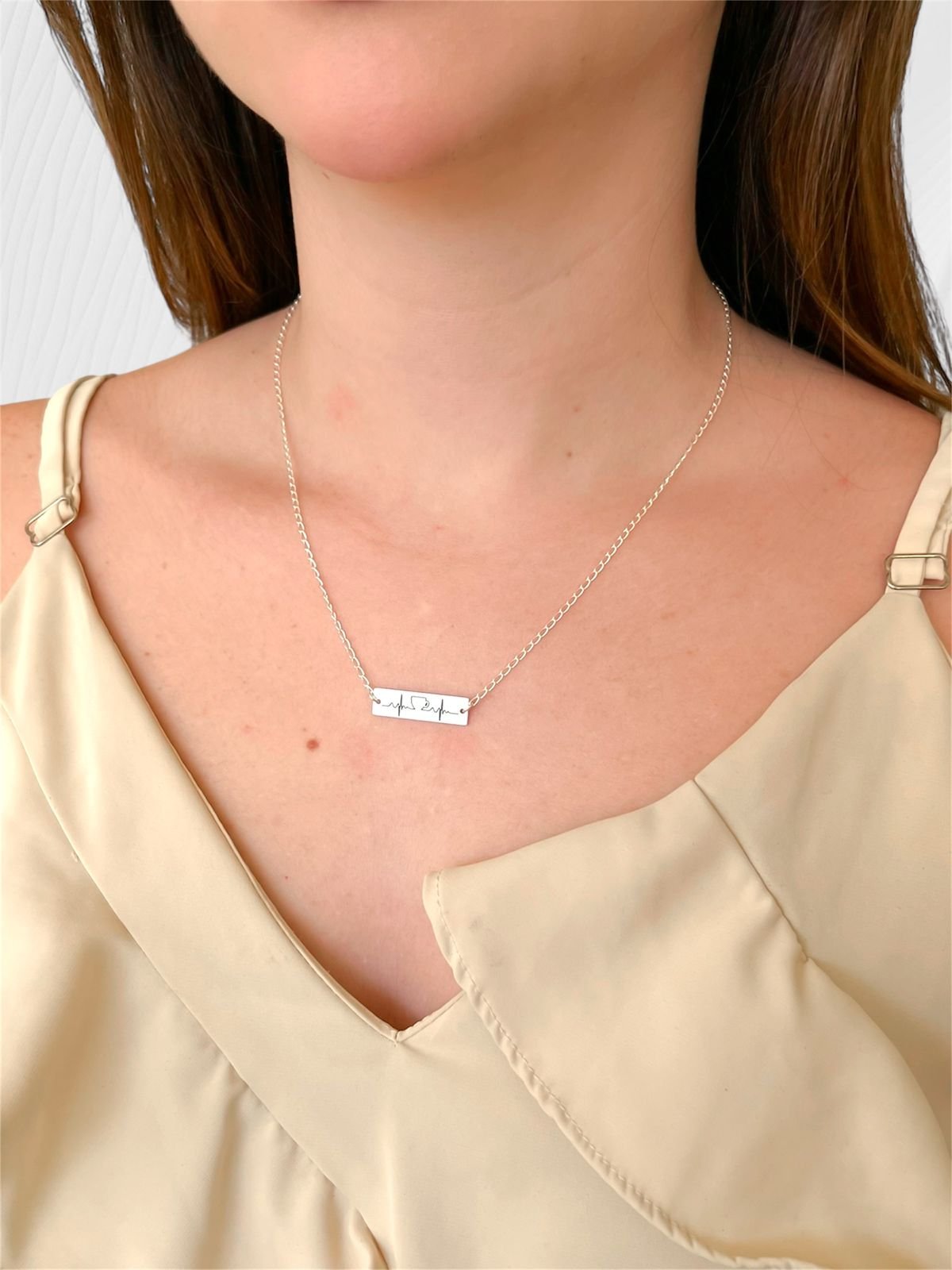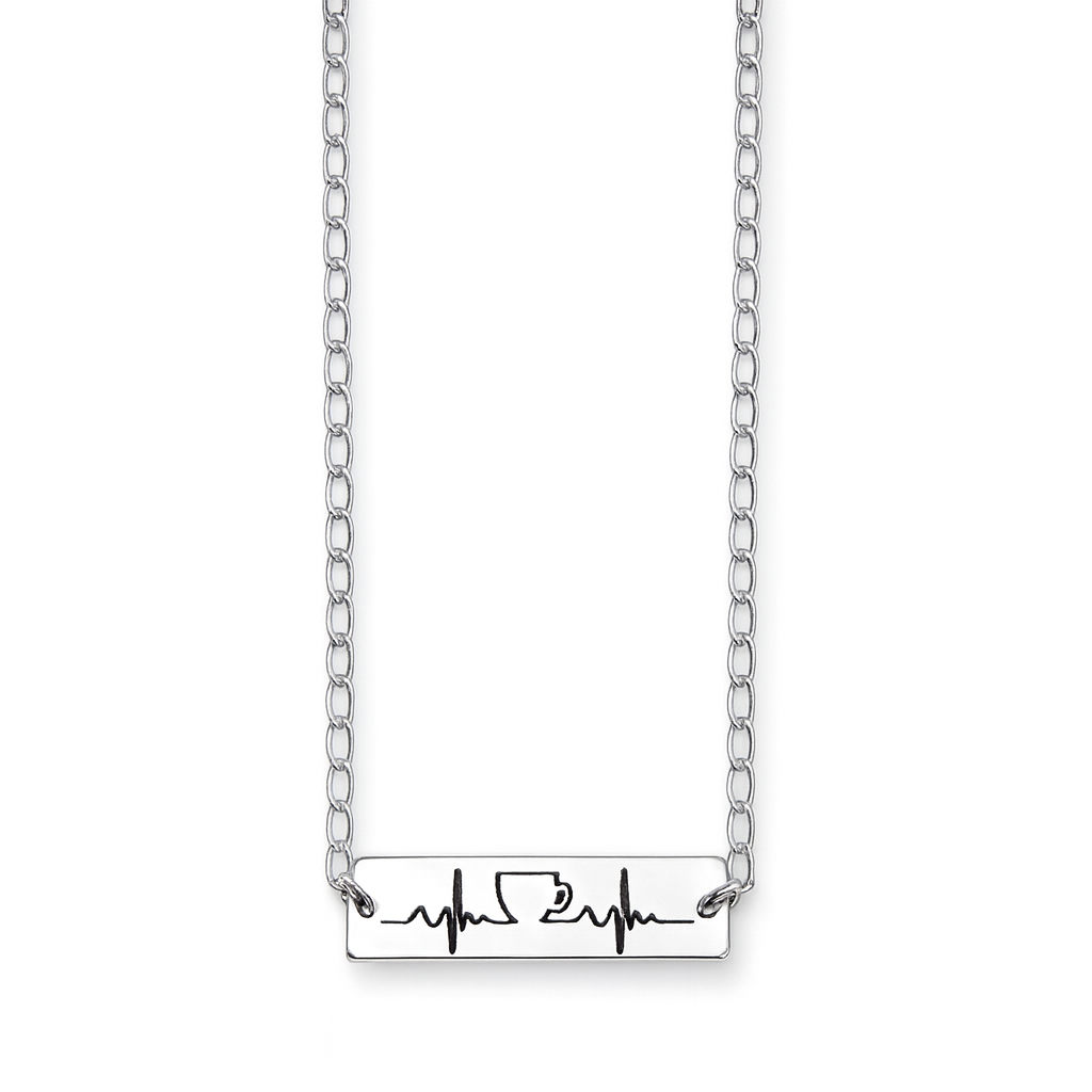 Colar em prata 925 com chapa lisa contendo o desenho de batimentos cardíacos e xícara de café central.