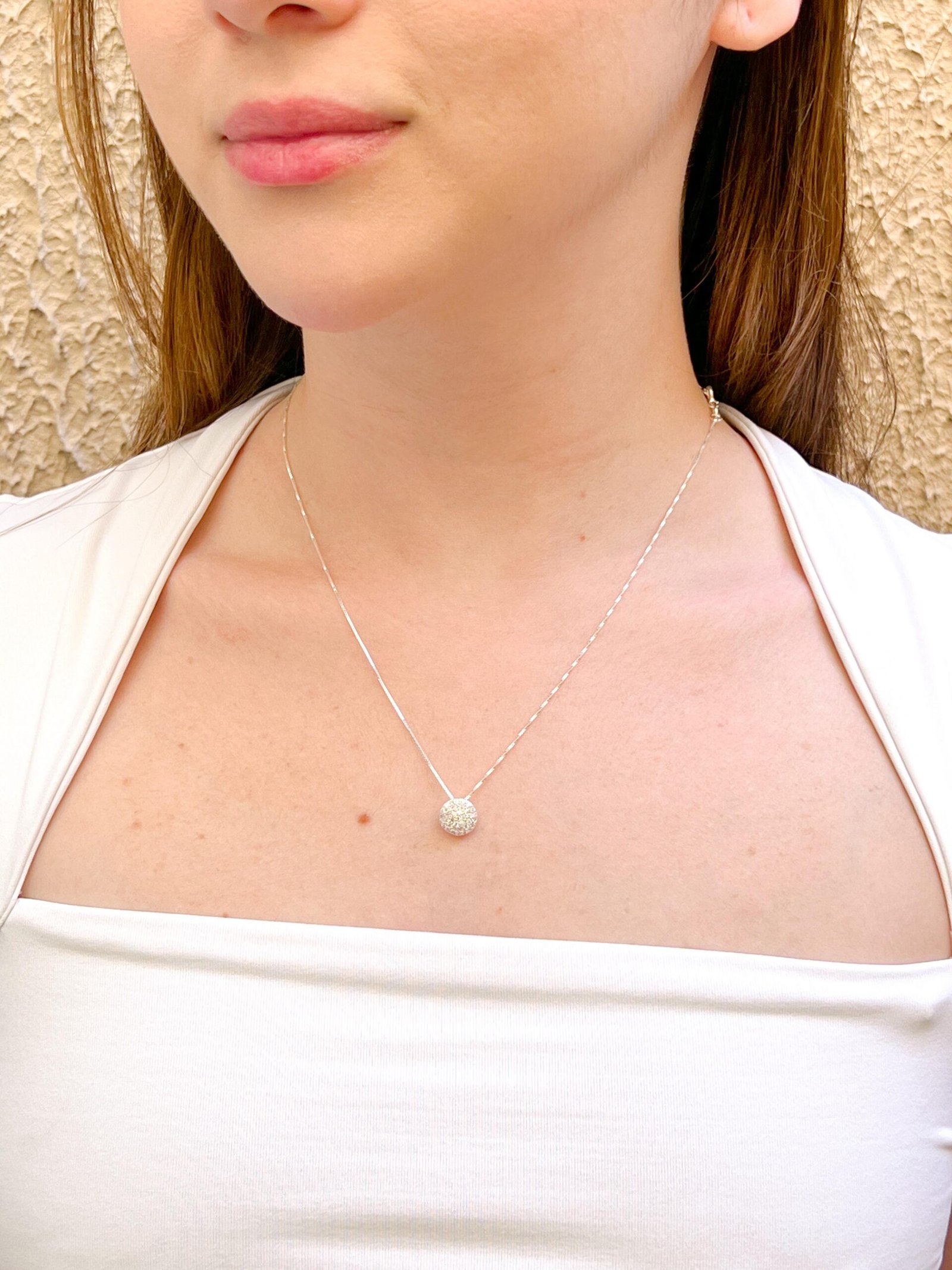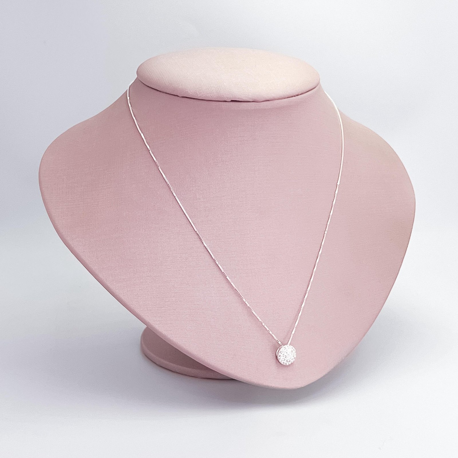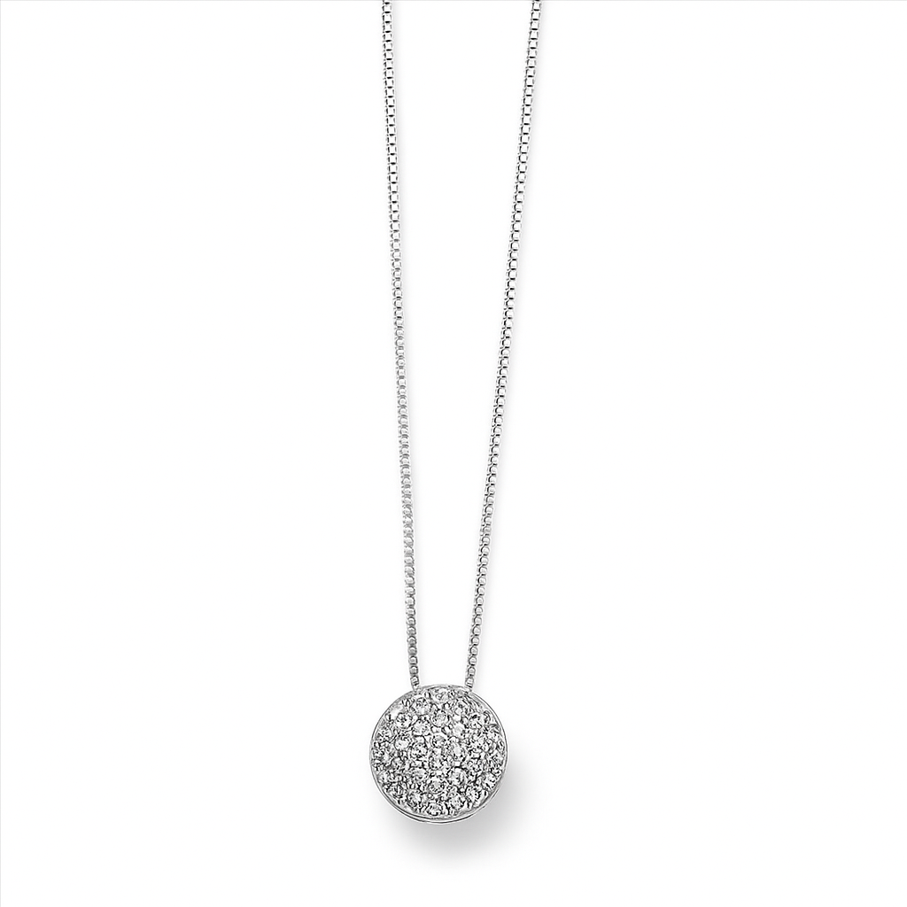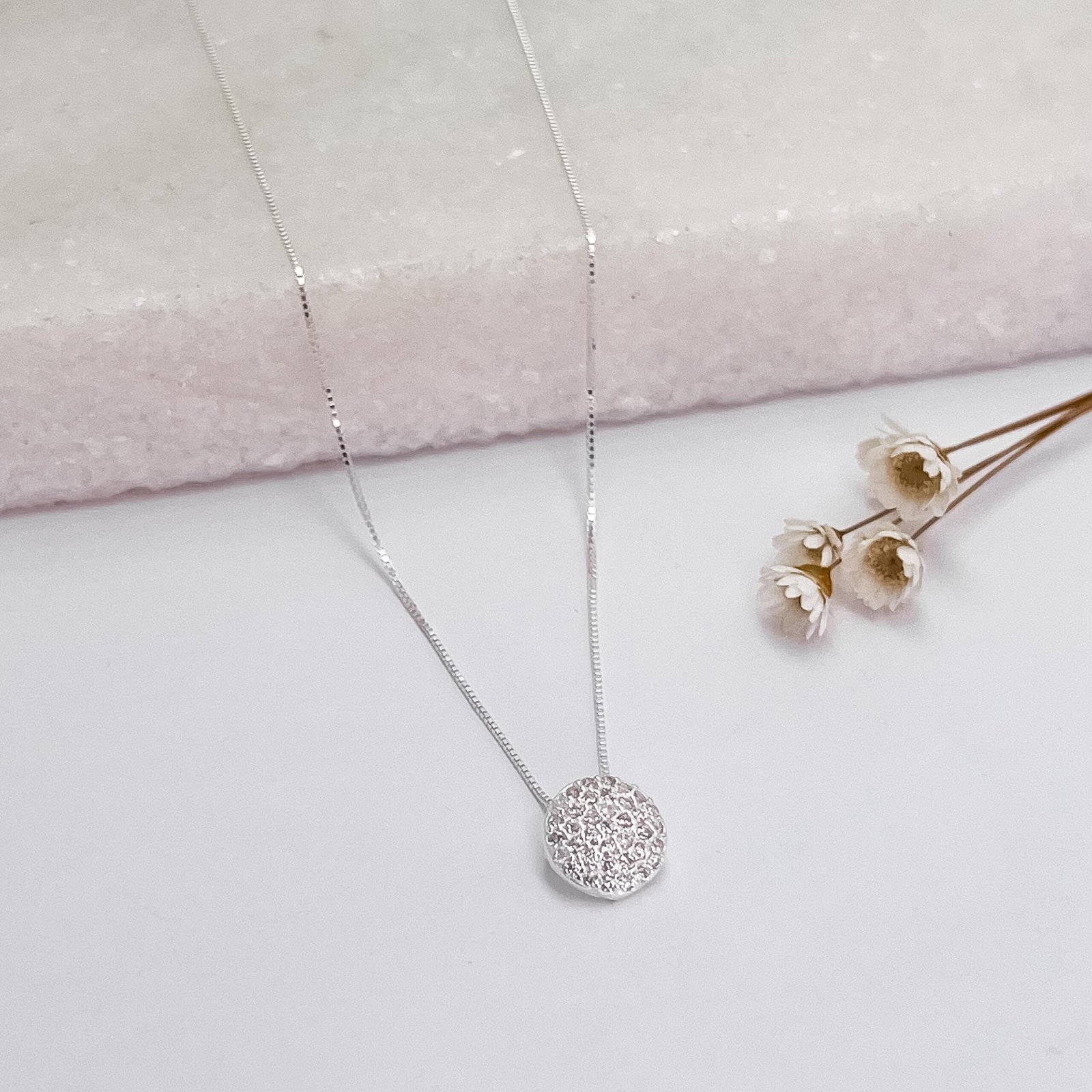 Colar em prata 925 com pingente de círculo cravejado, composto por zircônias que proporcionam brilho uniforme e acabamento delicado.