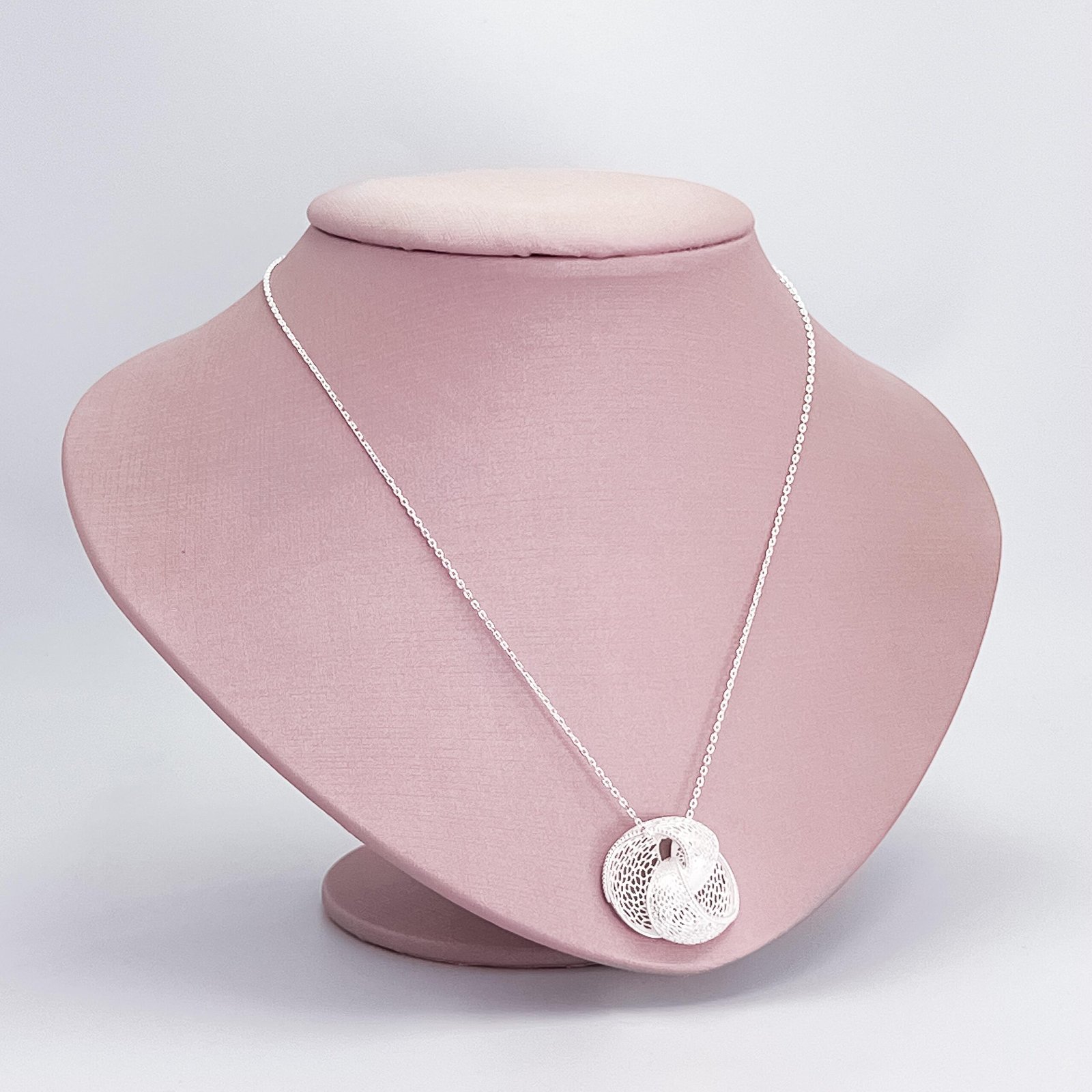 Colar em prata 925 com pingente em formato de arabesco, desenvolvido em linhas curvas e acabamento polido que destaca a estrutura vazada e o brilho da prata. A peça é montada na corrente de elos, que oferece caimento firme e visual marcado.