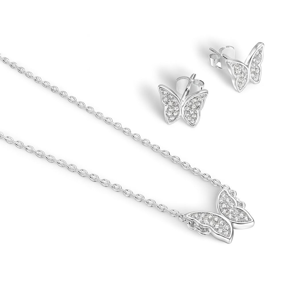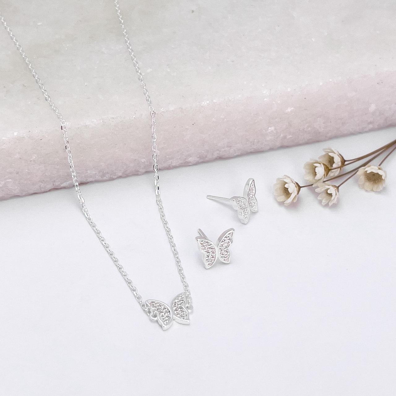 Conjunto em prata 925 com pingente de borboleta cravejada, acompanhado por corrente delicada e brincos combinando.