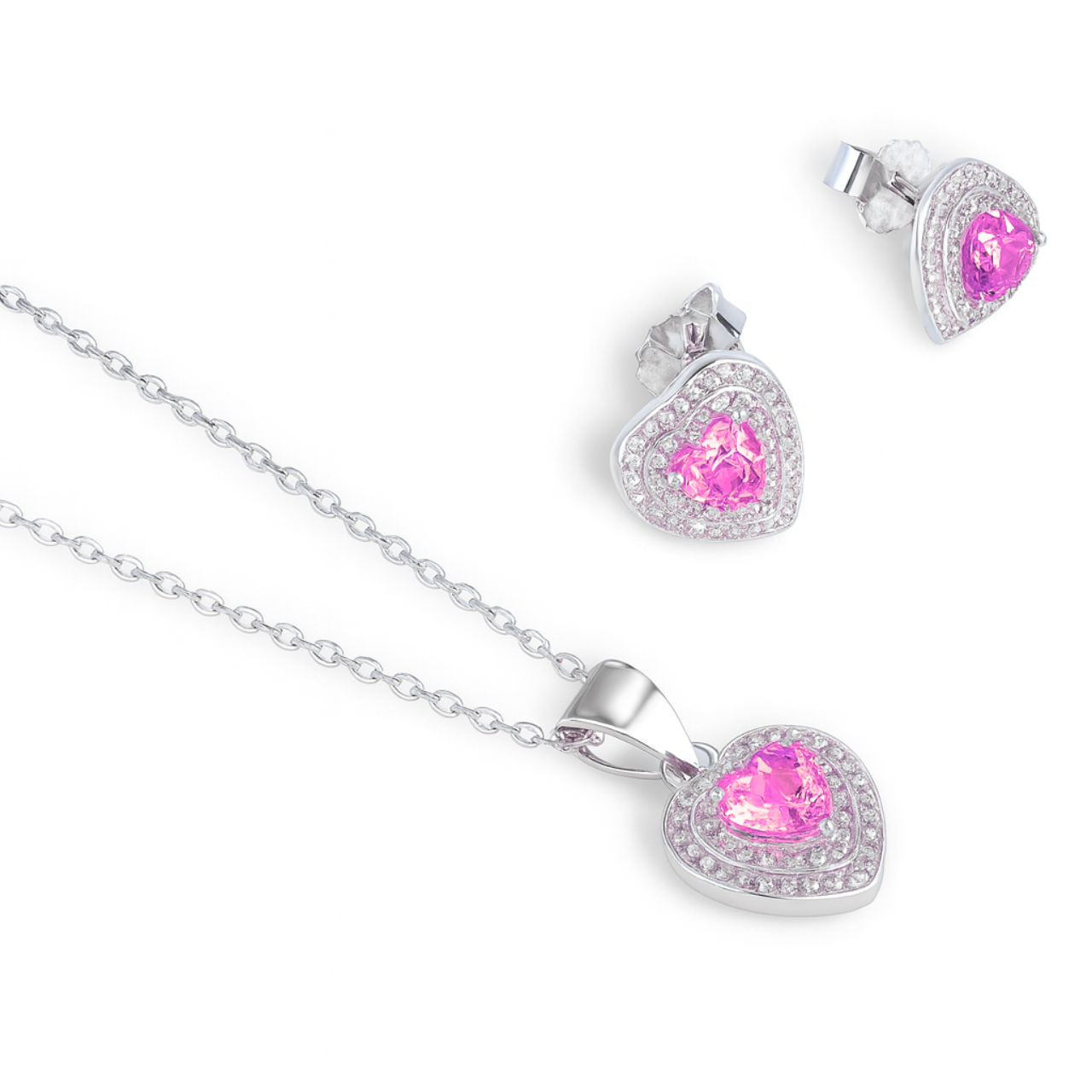 Conjunto confeccionado em prata 925, composto por colar e brincos com coração cravejado colorido de 4mm.