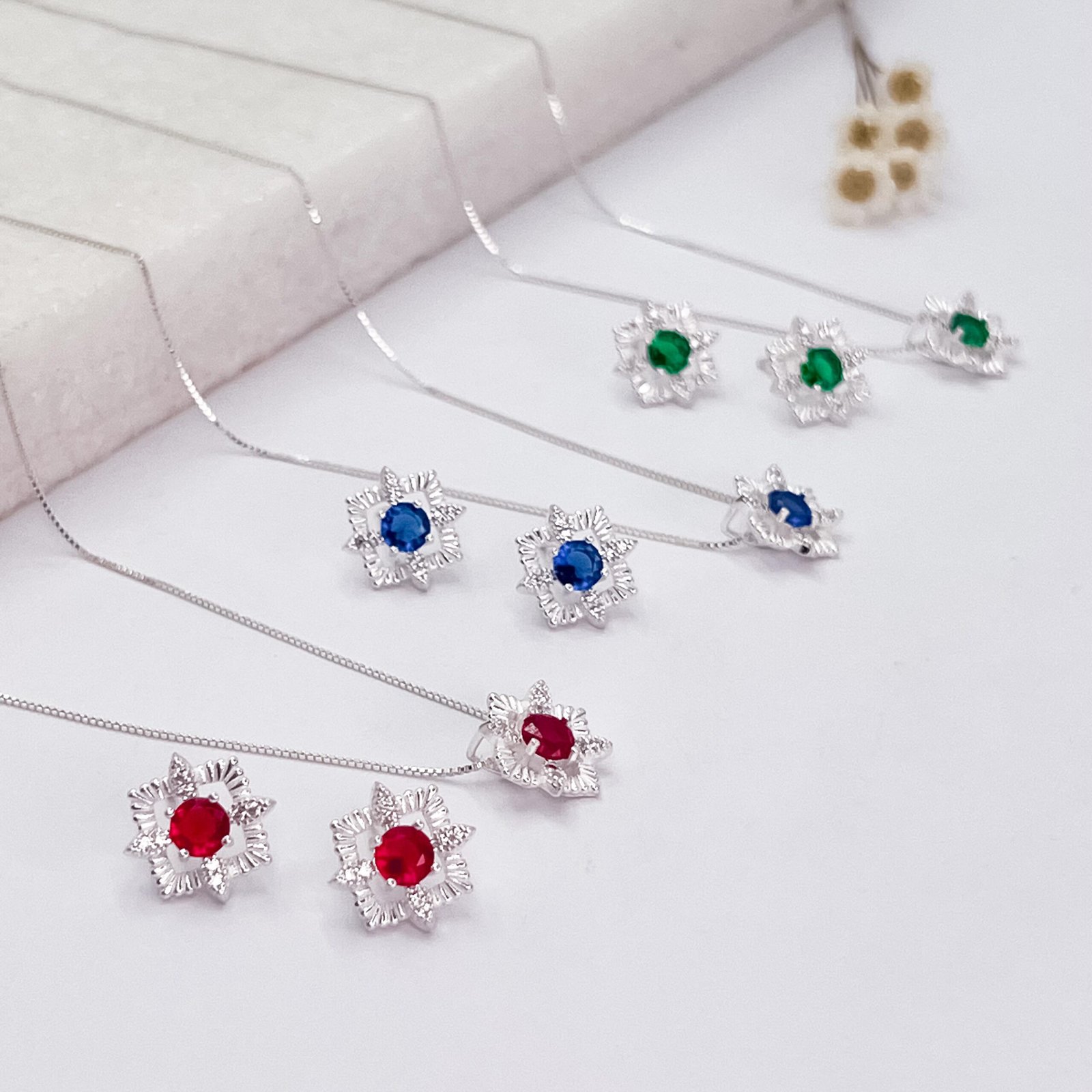Início COLARES Conjunto Conjunto Prata Color Flor Zirconia Centro
