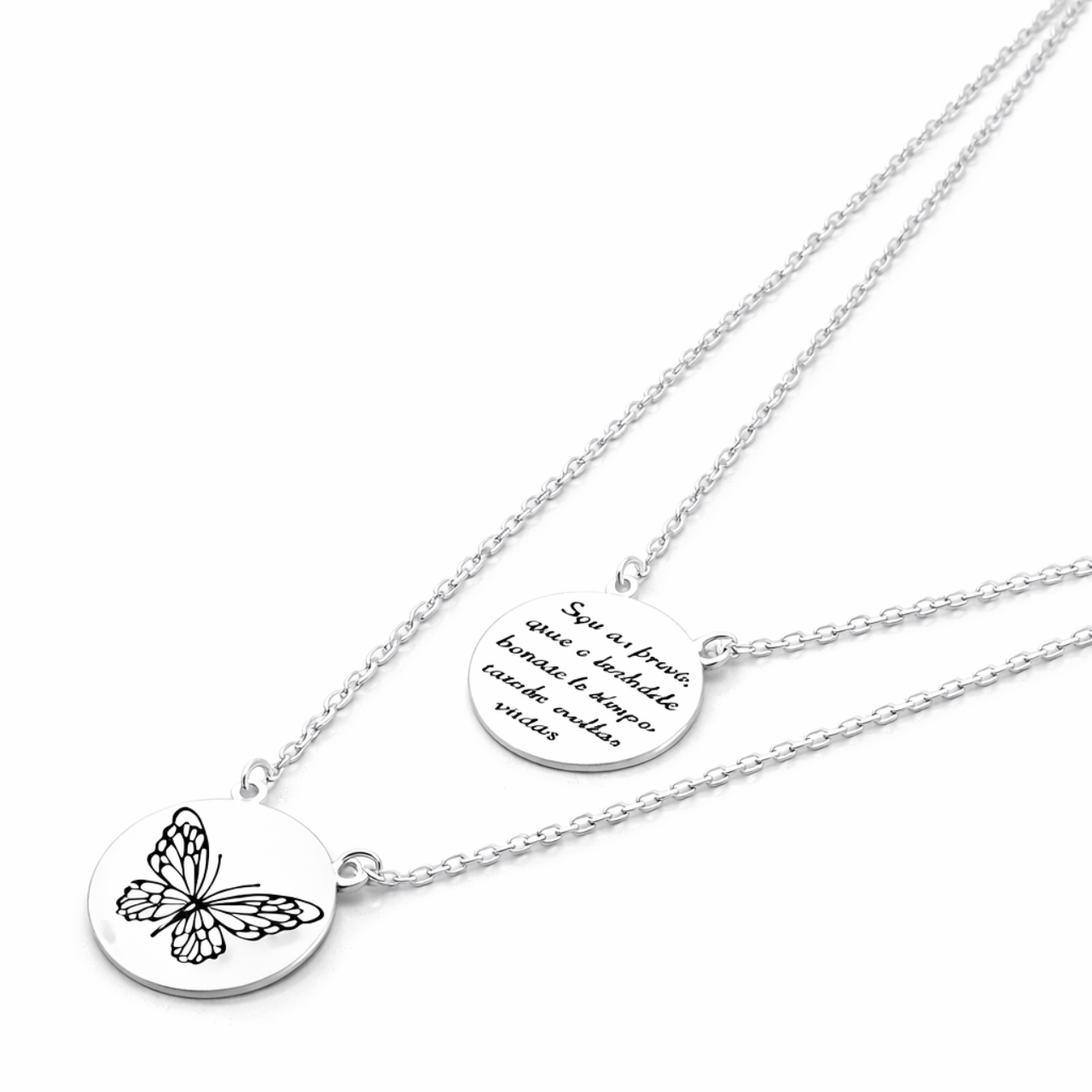 Detalhes Escapulario prata frase (sigo em frente como borboleta, buscando sempre minha melhor versão)