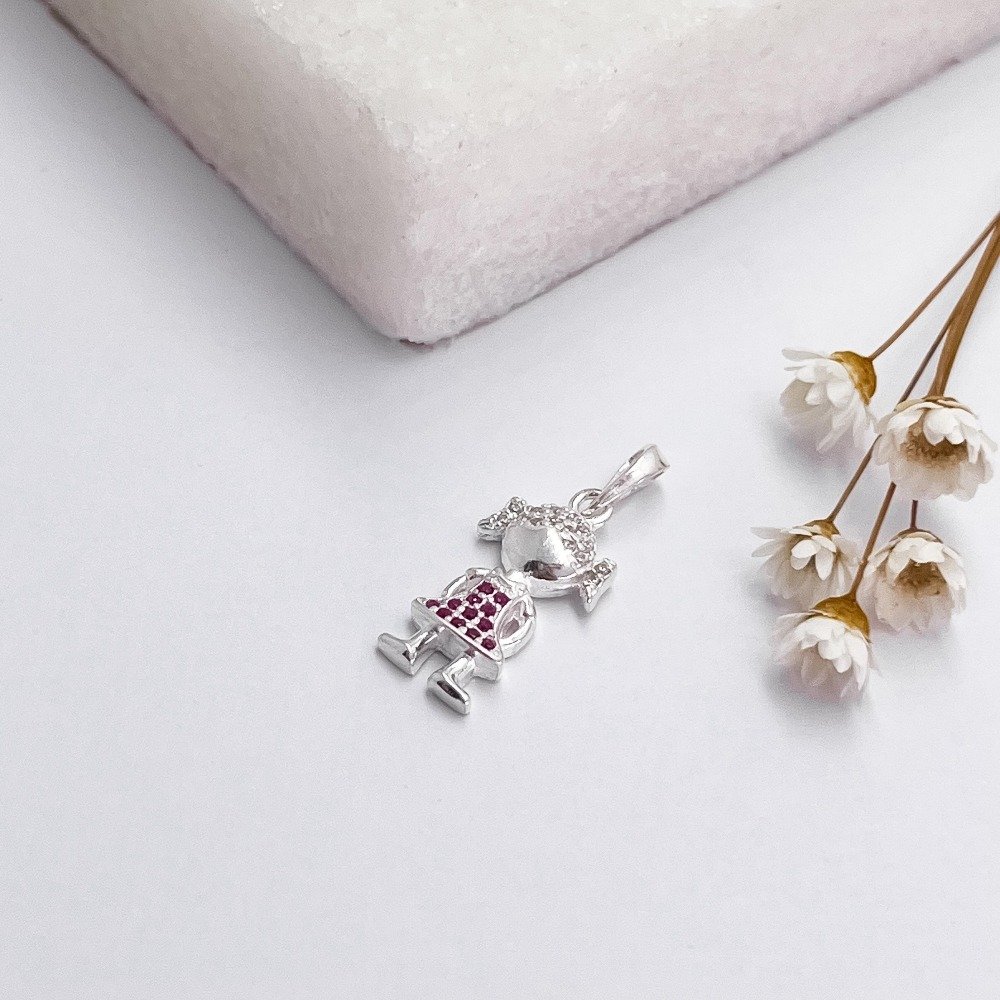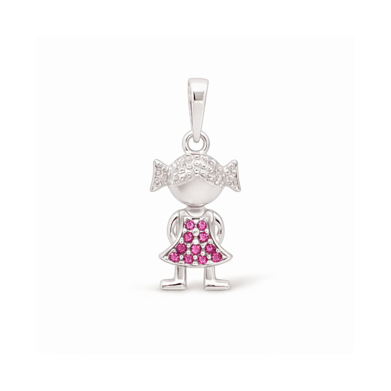 Pingente prata menina cravejada com zircônias cristal e no vestido zircônias rosa.