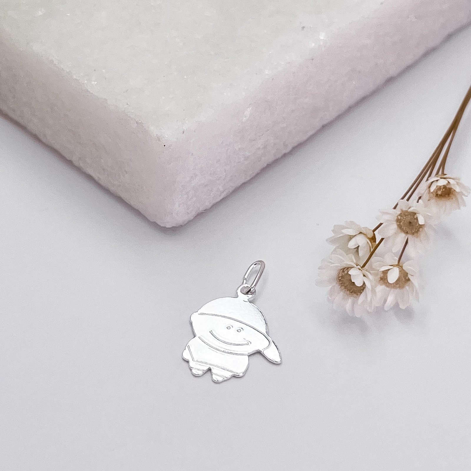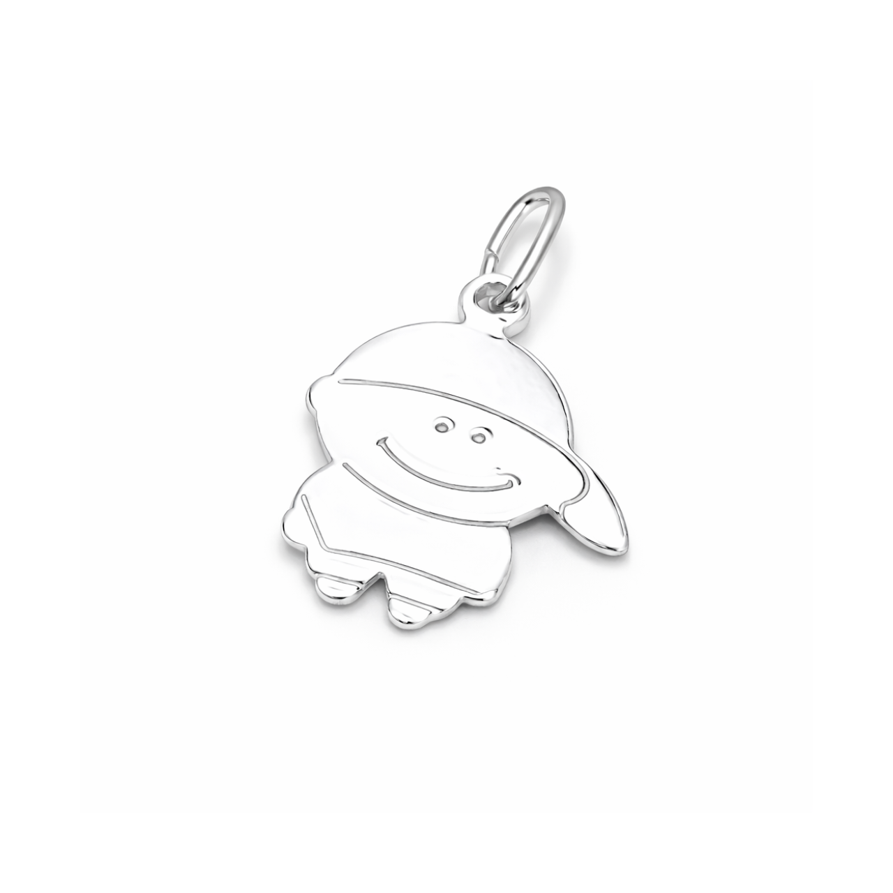 Detalhes Pingente em prata no formato de menino; estilo chapa lisa com 1,5 cm aproximados