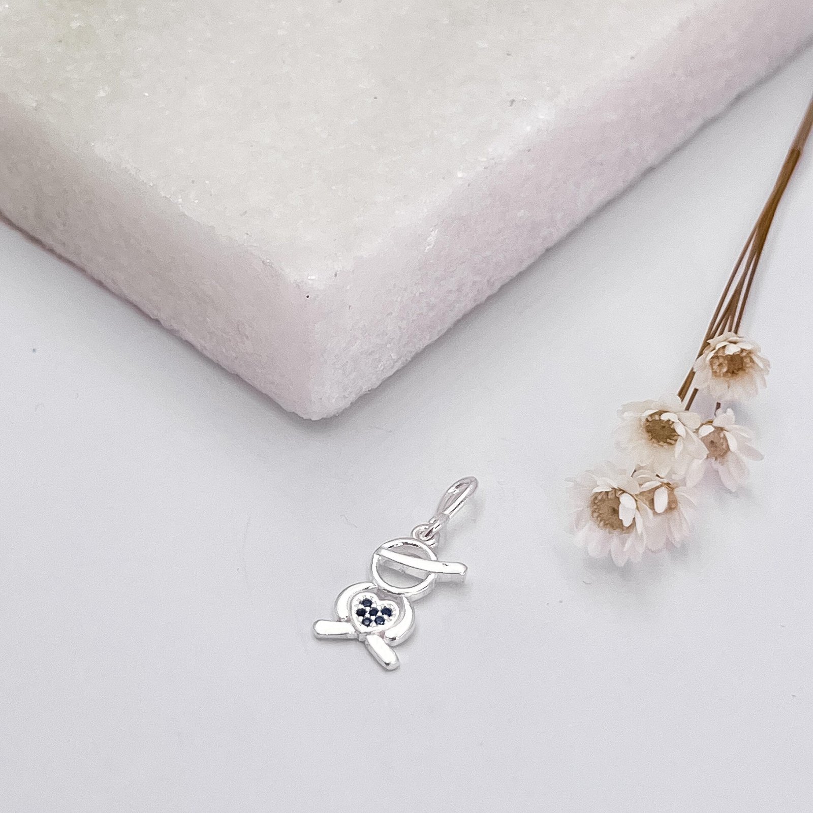 Detalhes Pingente em prata no formato de menina vazado com coração no meio; cravejado na cor azul