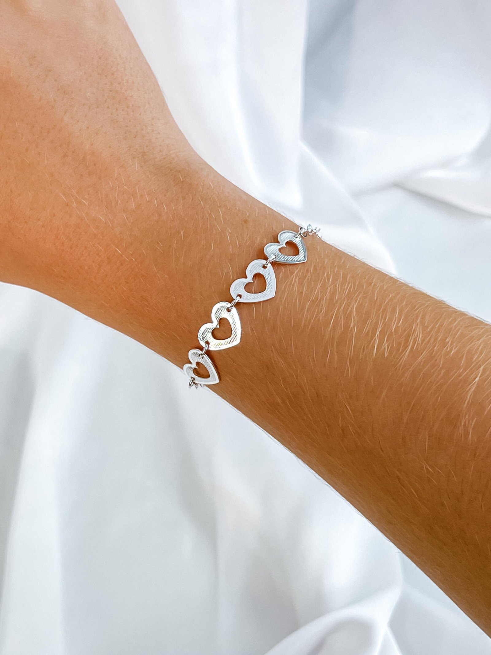 Detalhes Pulseira prata 925 com 4 corações vazado com textura