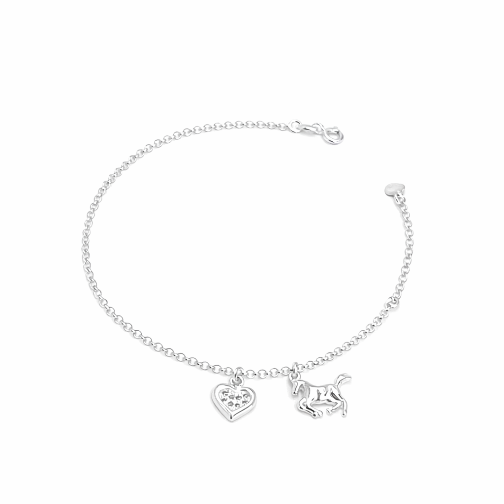Detalhes Pulseira em prata com 1 pingente de cavalo e 1 de coração cravejado.