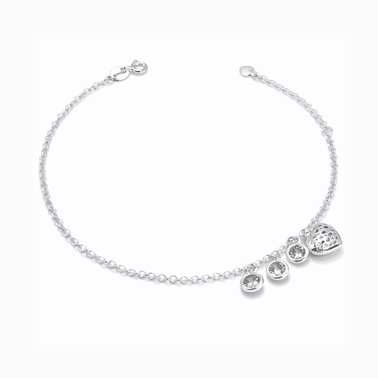Detalhes Pulseira prata elo portugues ping coração furadinho e 3 zirconias